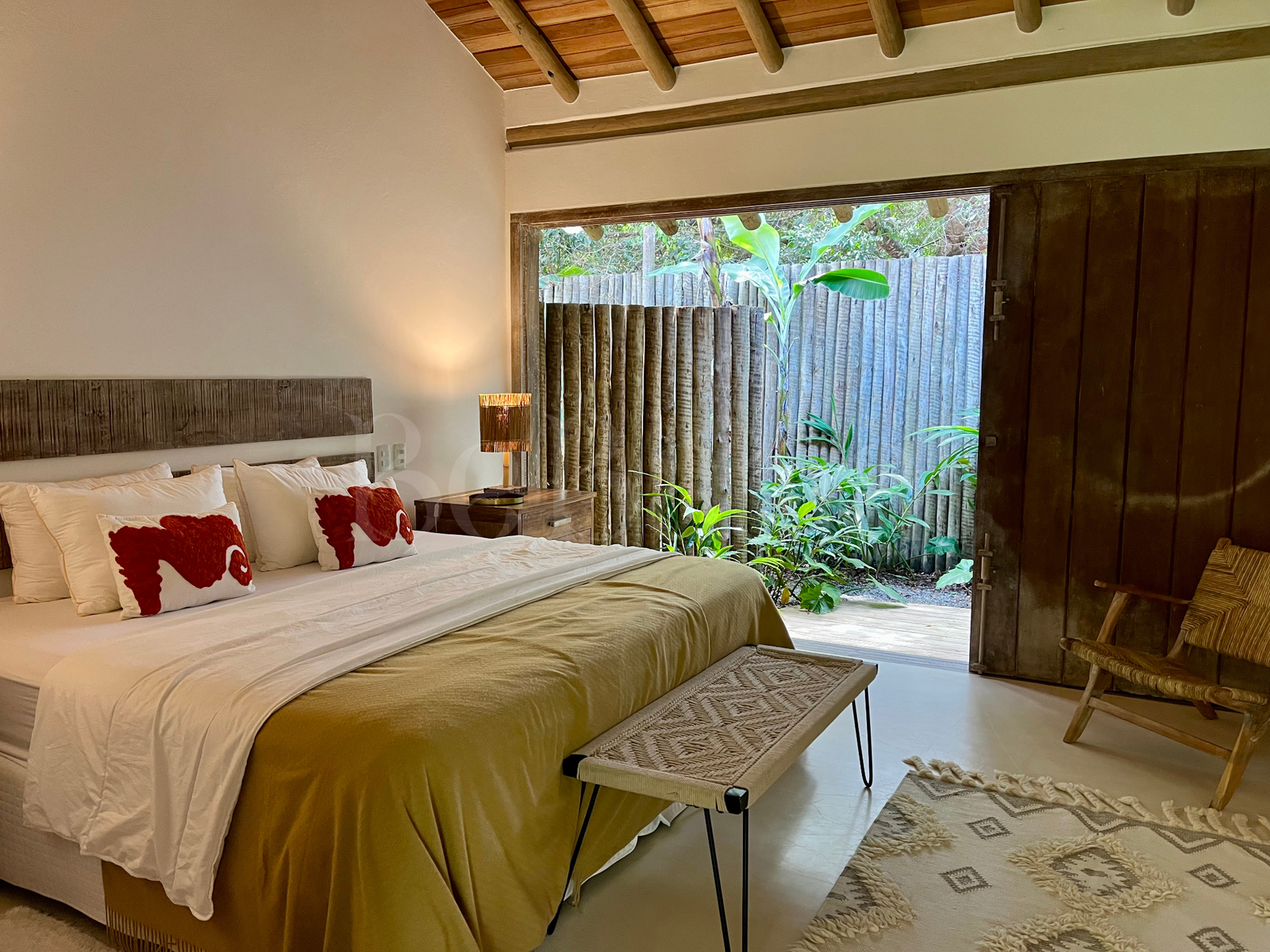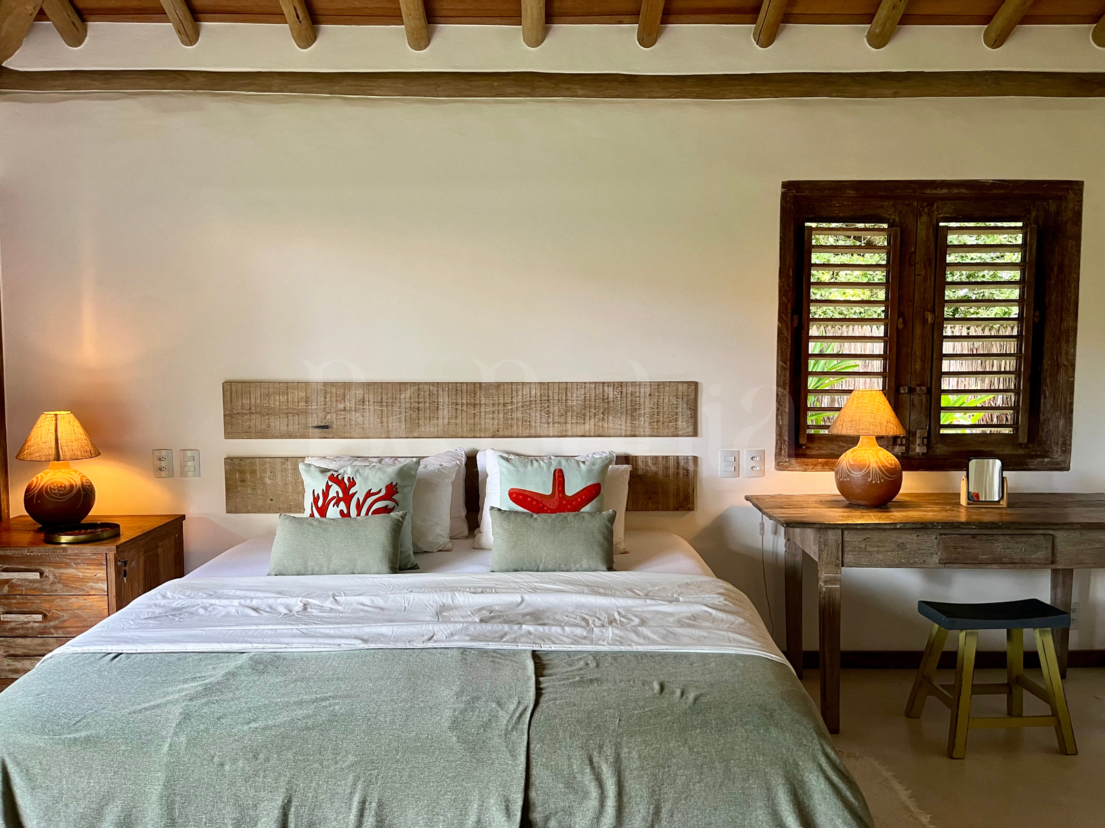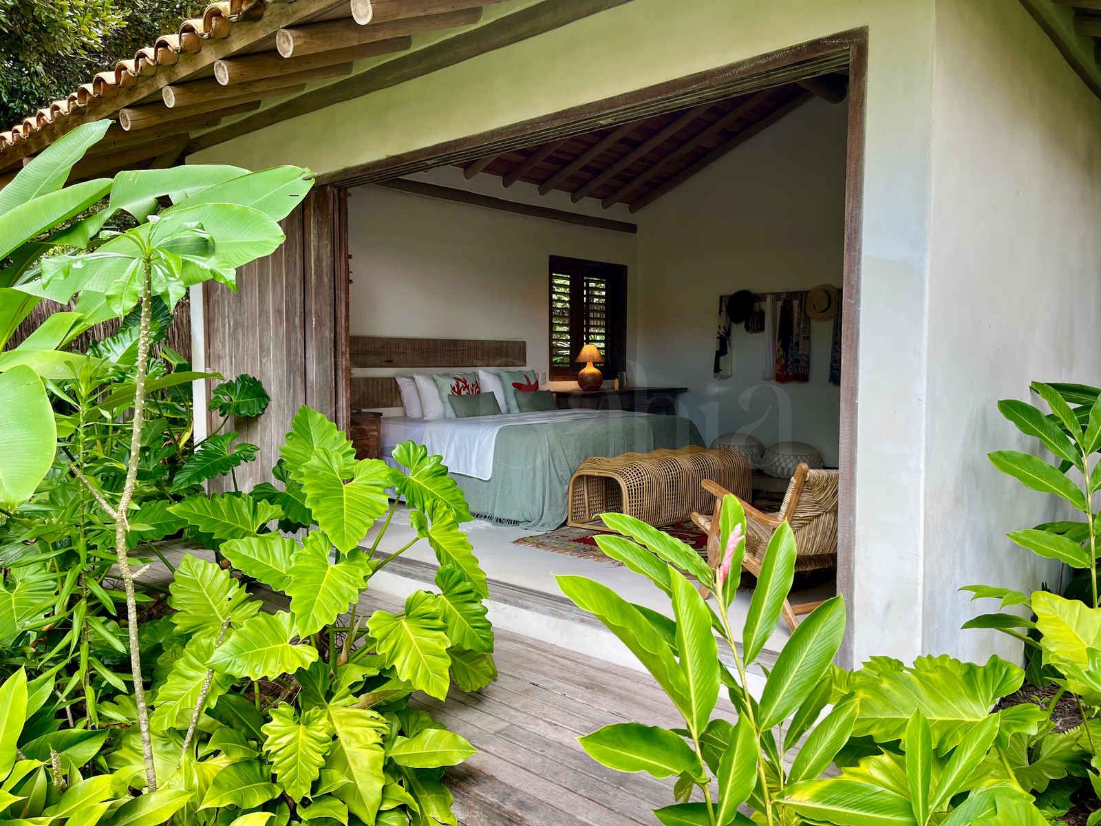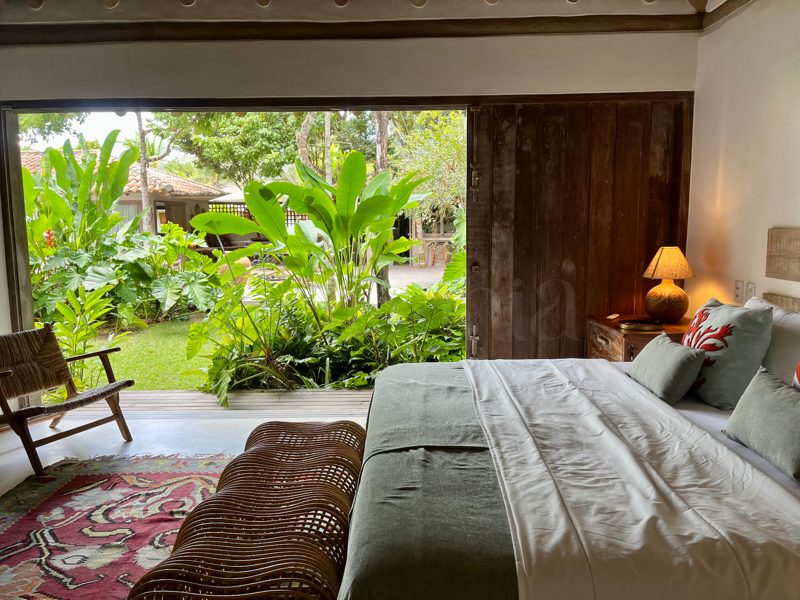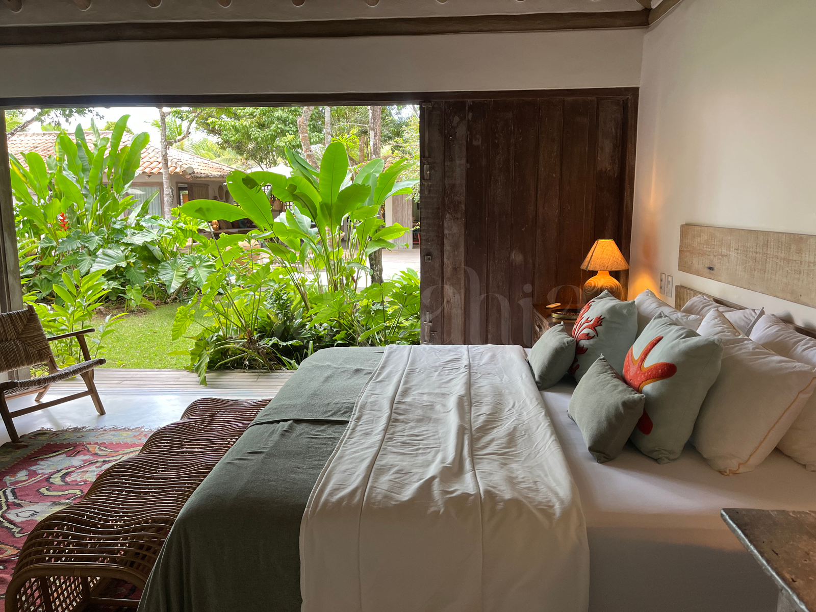 A propriedade dispõe de cinco suítes confortáveis e elegantes, todas equipadas com ar-condicionado e cuidadosamente decoradas. A suíte máster oferece cama king size, jardim privativo e banheiro equipado com secador de cabelo, criando um espaço exclusivo e acolhedor. Outras duas suítes também contam com camas king size e jardins individuais, garantindo privacidade e tranquilidade. Já as duas suítes adicionais dispõem de camas de solteiro que podem ser convertidas em cama de casal, proporcionando flexibilidade para diferentes perfis de hóspedes. Cada quarto foi pensado para oferecer descanso absoluto, com iluminação natural e integração ao verde que envolve a casa.