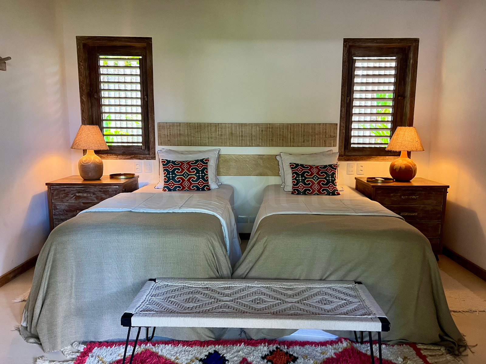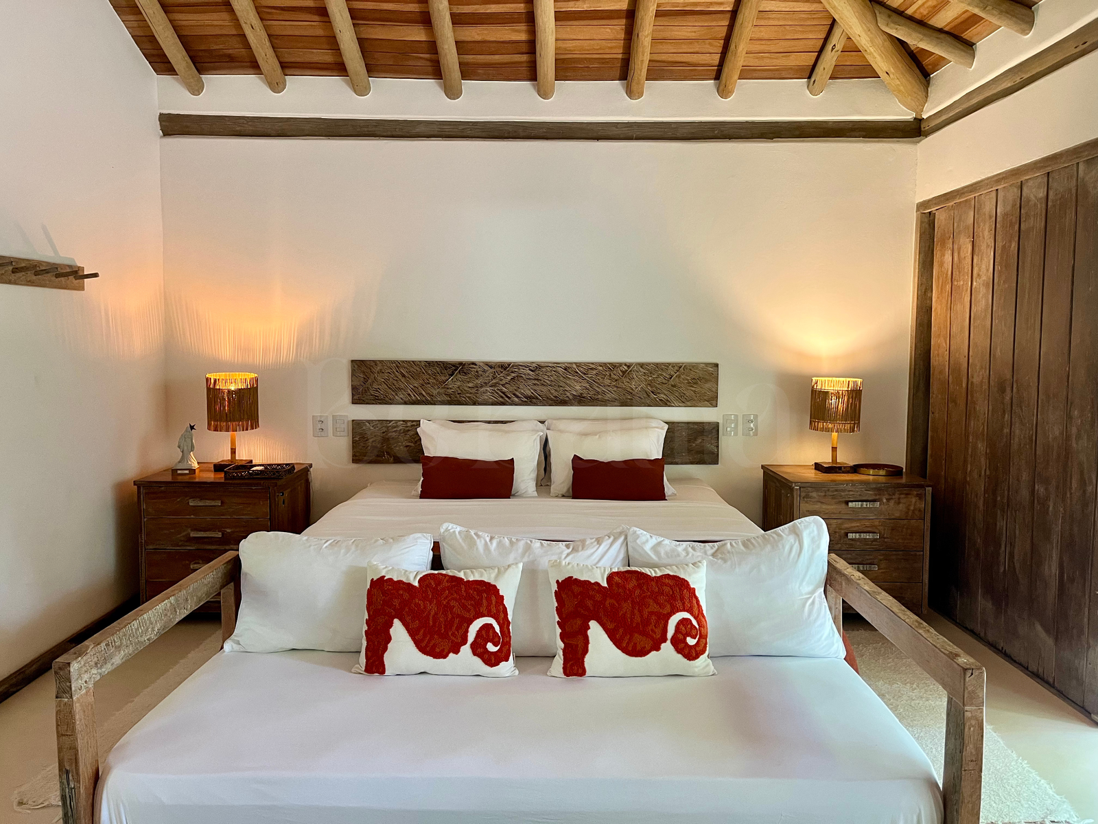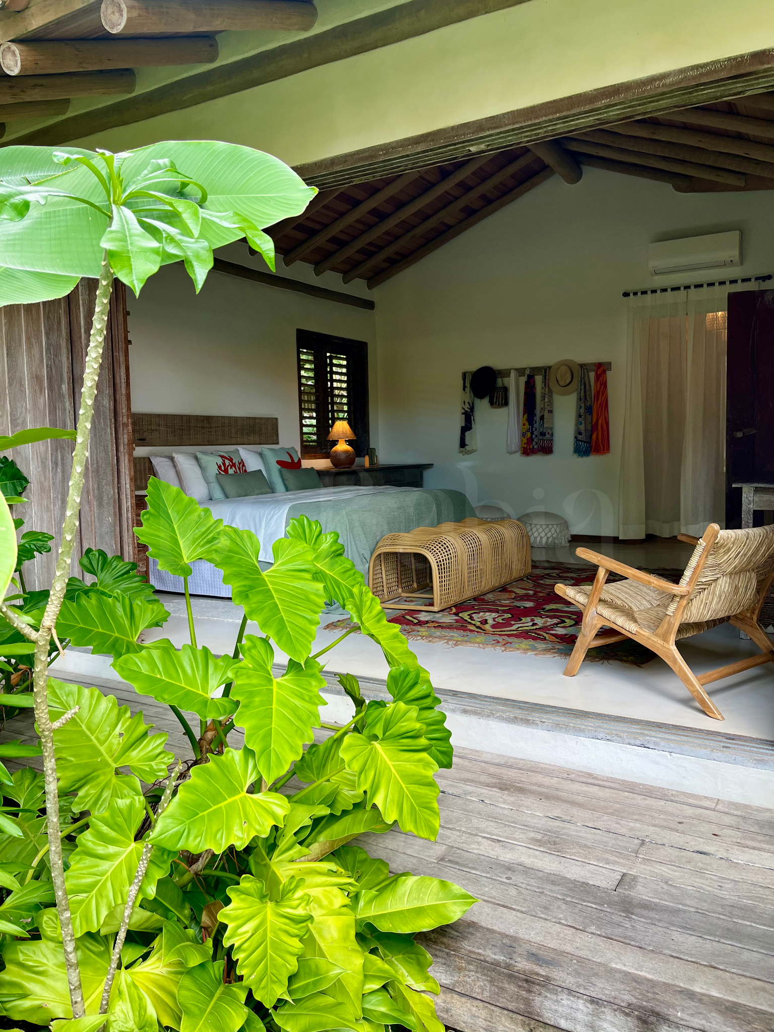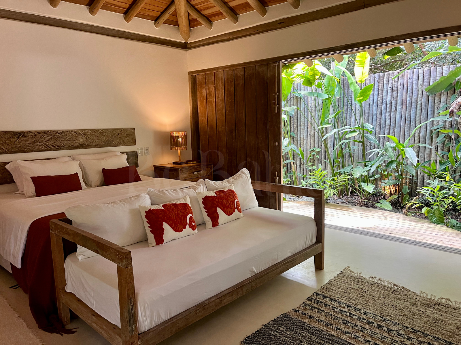 A propriedade dispõe de cinco suítes confortáveis e elegantes, todas equipadas com ar-condicionado e cuidadosamente decoradas. A suíte máster oferece cama king size, jardim privativo e banheiro equipado com secador de cabelo, criando um espaço exclusivo e acolhedor. Outras duas suítes também contam com camas king size e jardins individuais, garantindo privacidade e tranquilidade. Já as duas suítes adicionais dispõem de camas de solteiro que podem ser convertidas em cama de casal, proporcionando flexibilidade para diferentes perfis de hóspedes. Cada quarto foi pensado para oferecer descanso absoluto, com iluminação natural e integração ao verde que envolve a casa.