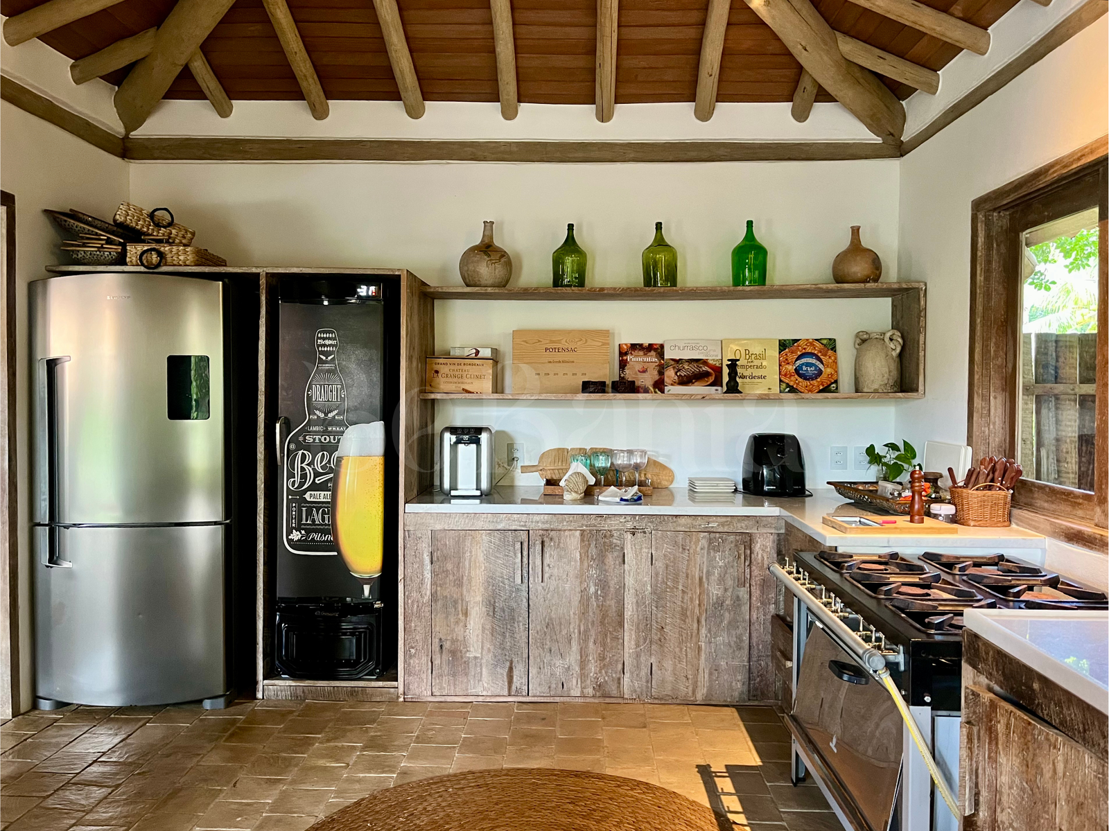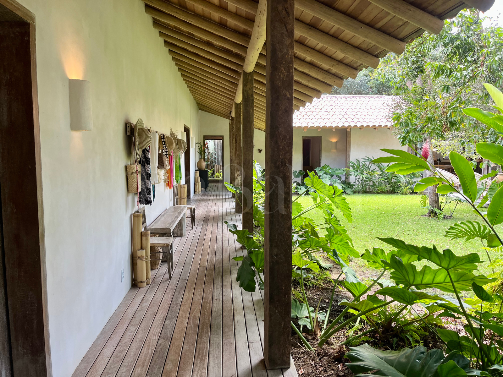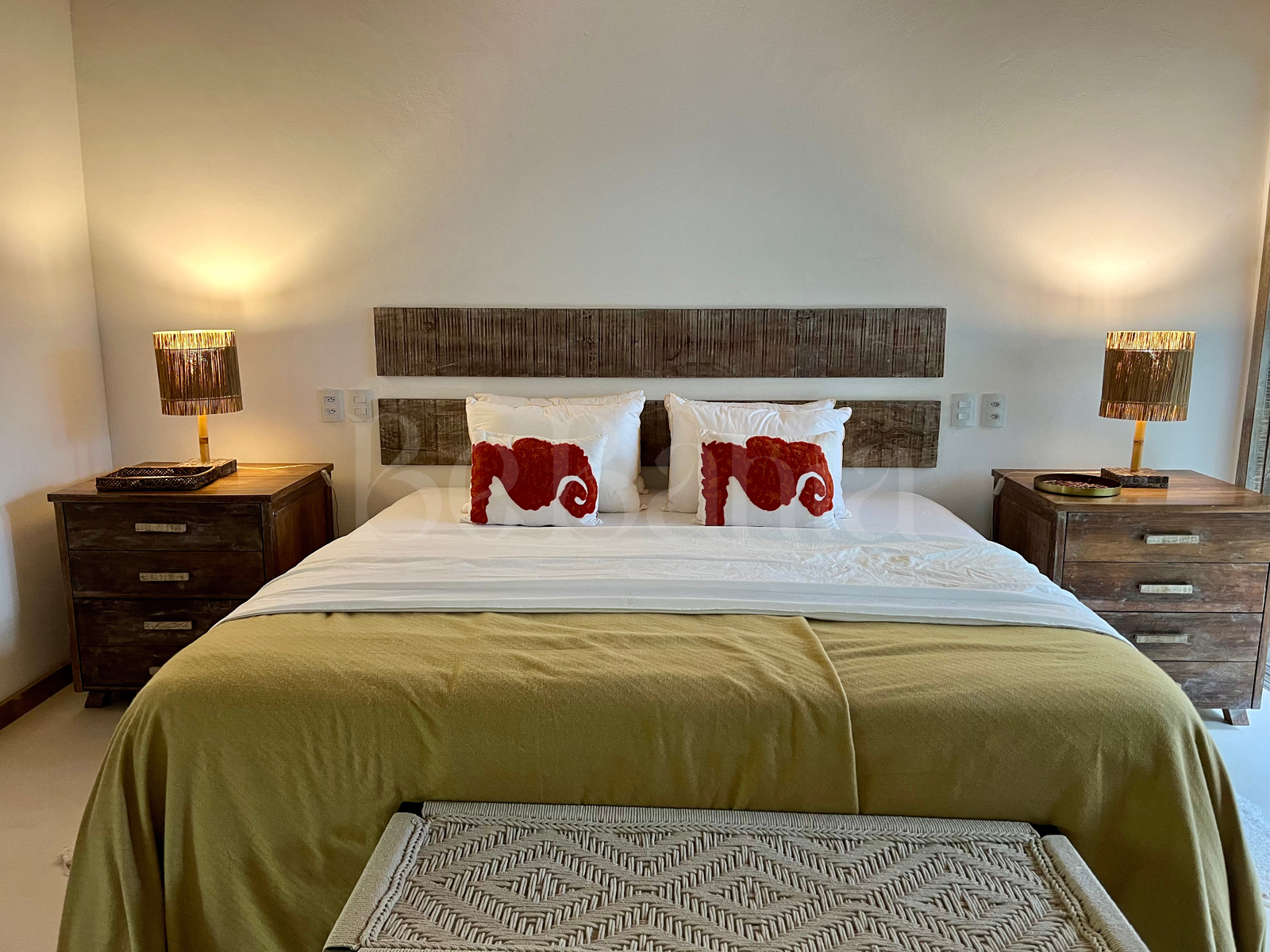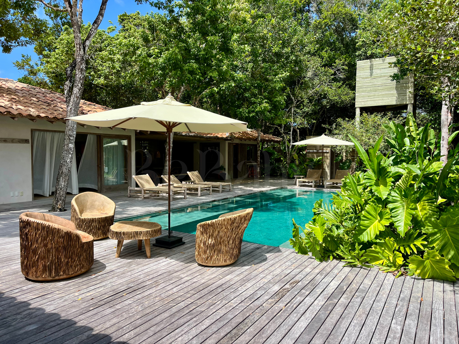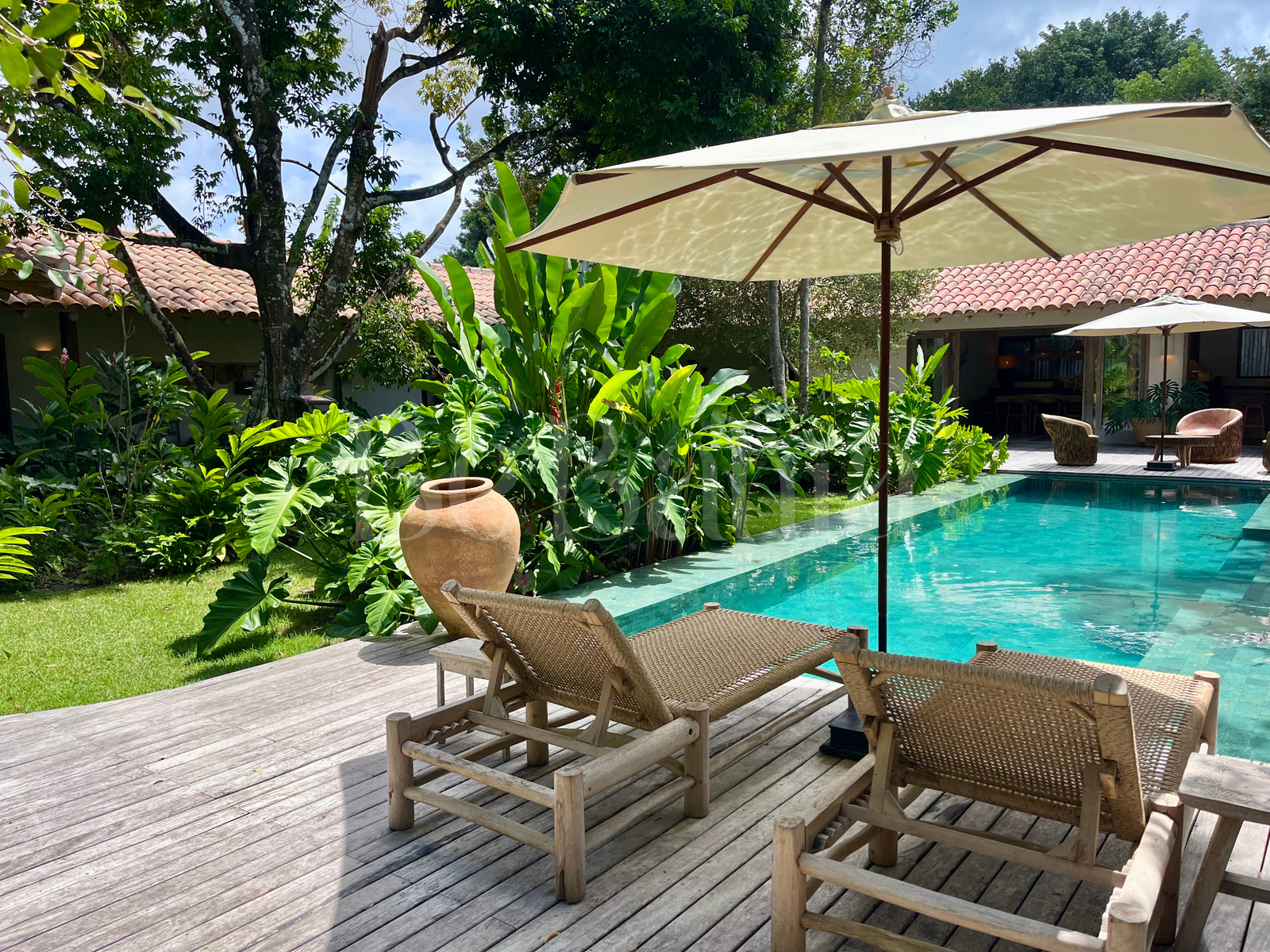 A propriedade dispõe de cinco suítes confortáveis e elegantes, todas equipadas com ar-condicionado e cuidadosamente decoradas. A suíte máster oferece cama king size, jardim privativo e banheiro equipado com secador de cabelo, criando um espaço exclusivo e acolhedor. Outras duas suítes também contam com camas king size e jardins individuais, garantindo privacidade e tranquilidade. Já as duas suítes adicionais dispõem de camas de solteiro que podem ser convertidas em cama de casal, proporcionando flexibilidade para diferentes perfis de hóspedes. Cada quarto foi pensado para oferecer descanso absoluto, com iluminação natural e integração ao verde que envolve a casa.