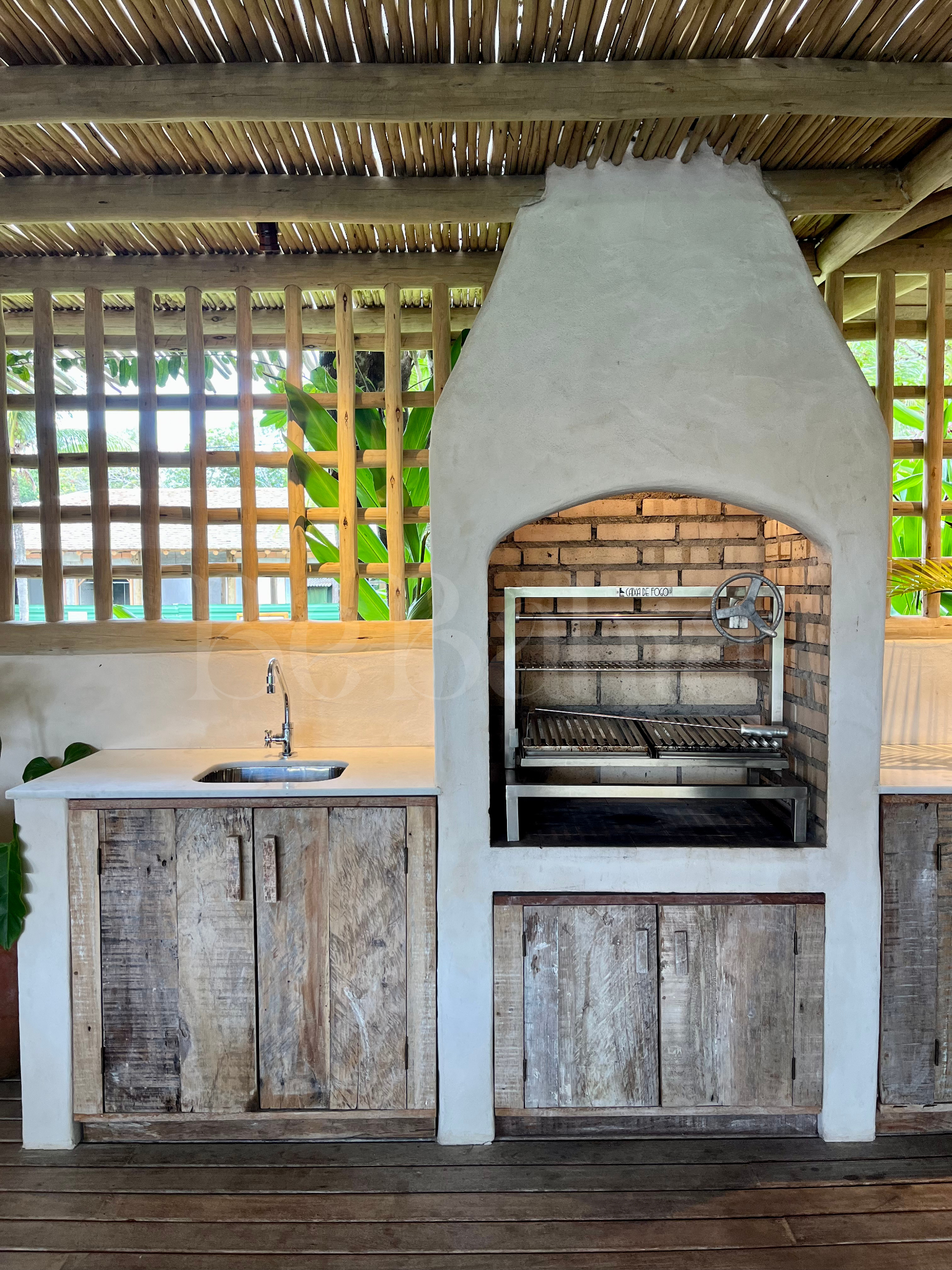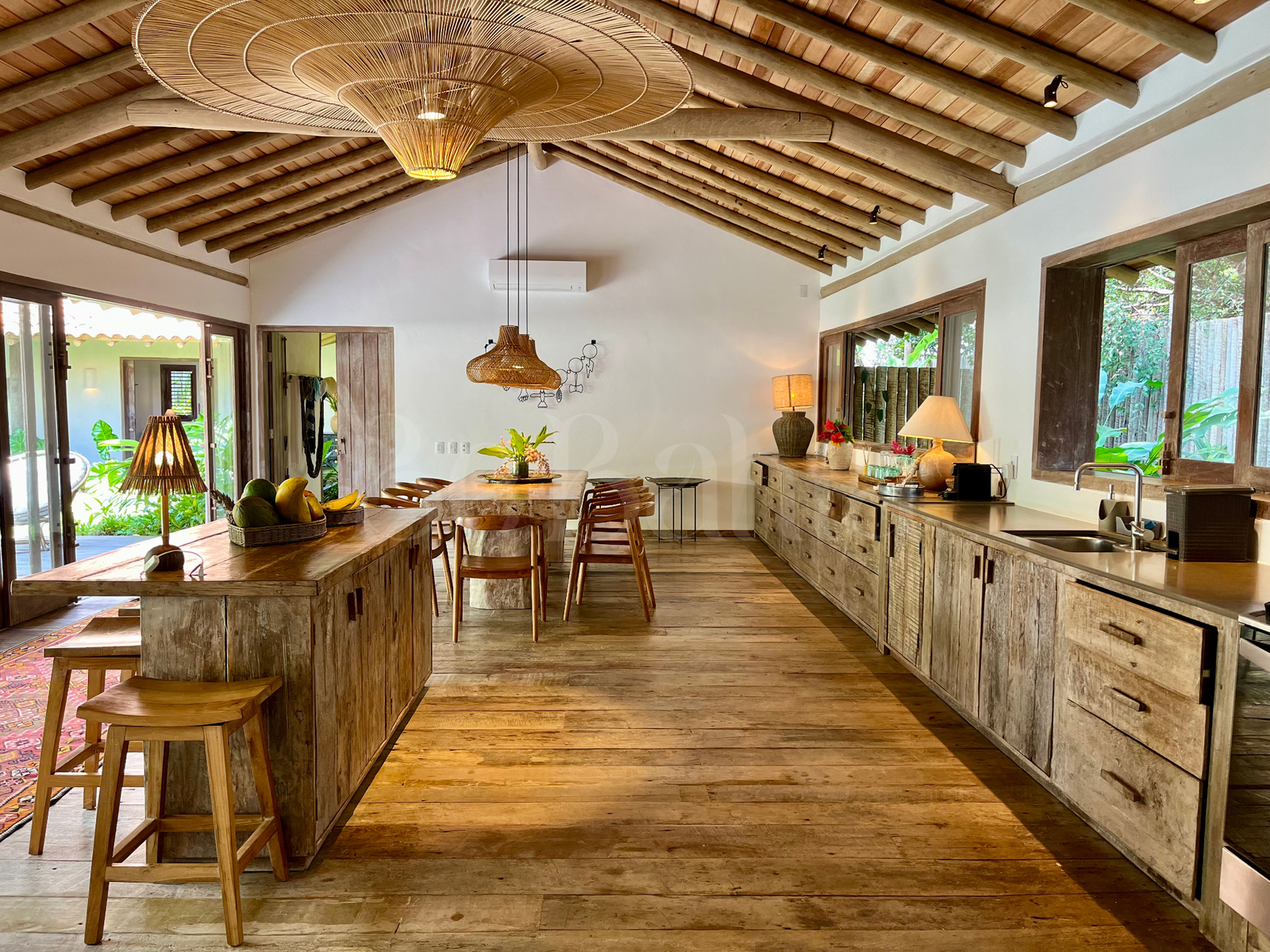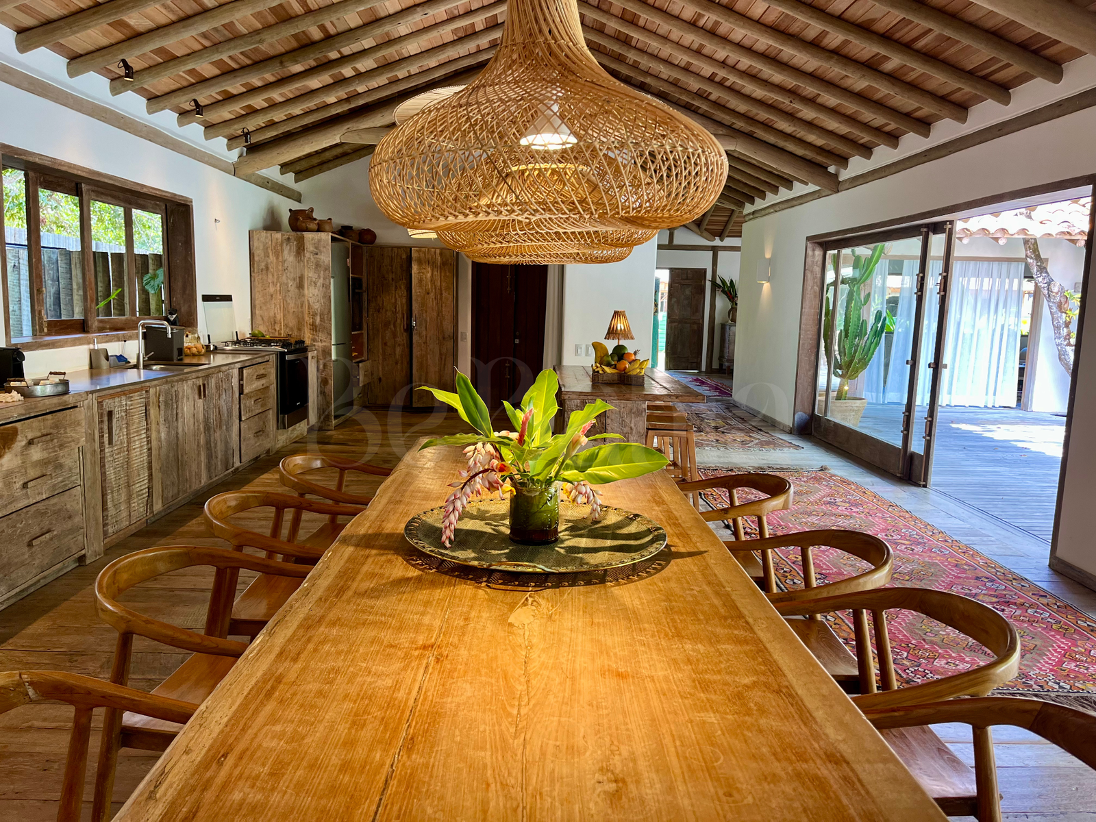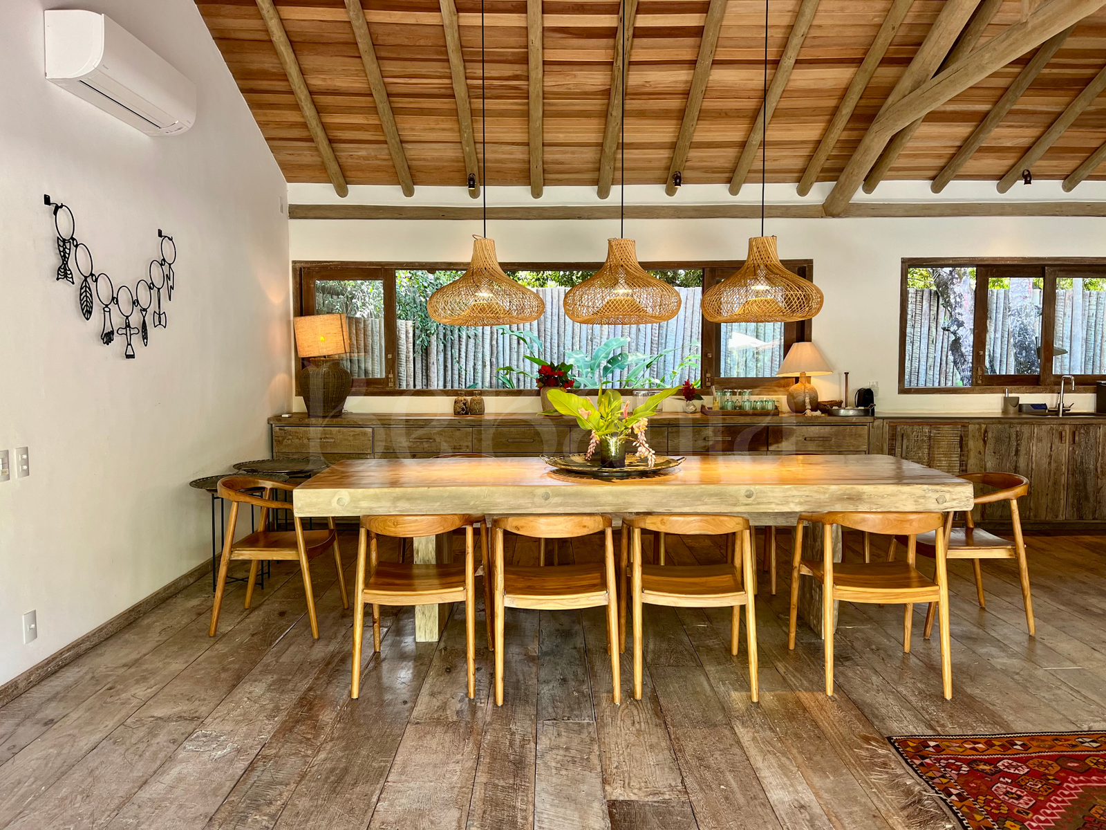 Os ambientes sociais da casa são amplos e convidativos. A cozinha, prática e equipada, conecta-se naturalmente à sala de jantar e à sala de estar, que por sua vez se abrem para o jardim. A atmosfera é de leveza e descontração, com generosas aberturas que permitem a ventilação cruzada e a entrada da brisa fresca, criando um clima de total harmonia entre interior e exterior.